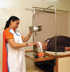 Pouring of medicated oils, milk & herbal decoction on the skull continuously and very slowly for a particular time limit is called Shirodhara. It is very effective in Hair loss, Alopecia, Sleeplessness, High blood pressure, Headache etc.